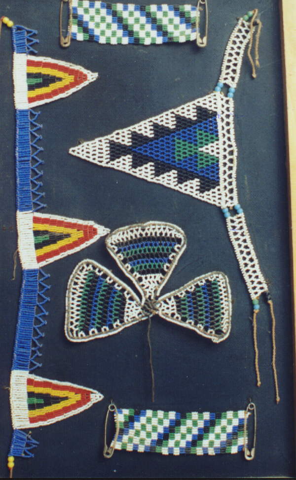 At the extreme left is an ubekelawini, also pinned to the headdress of a married woman. This applies likewise to the umayibunjane (extreme right) and to the cloverleaf-shaped object, isiphaphalazi (Zulu for "butterfly"), which has a spike to insert into the headdress.